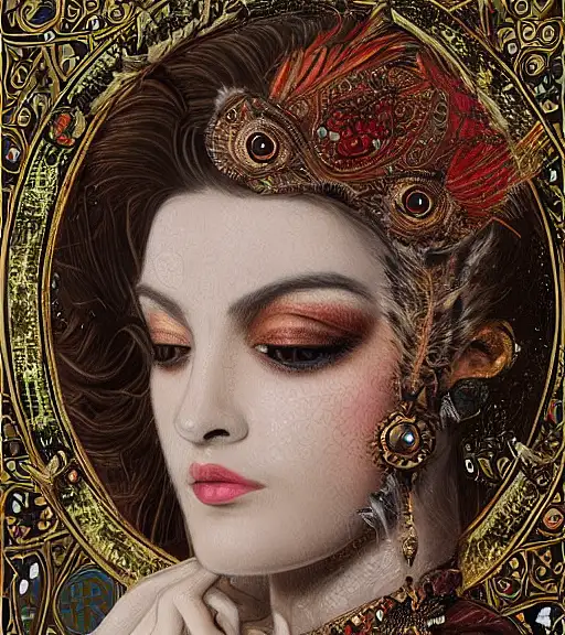 over 2 years ago high resolution 8k, raffaello master painter, Byzantine artwork, Owl, beautiful young lady close up face profile, feathers, intricate background, psychedelic hair, elegant white lace robe, hen, steampunk ,gemstones, 8k, vivid colours, floating, ruby, red accents, delicate features, gold, volumetric lighting, , --ar 12:24 --chaos 35 --uplight Dianozza 0 19