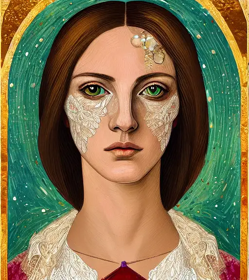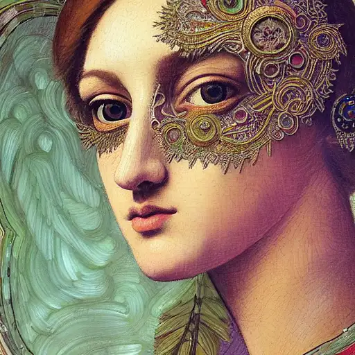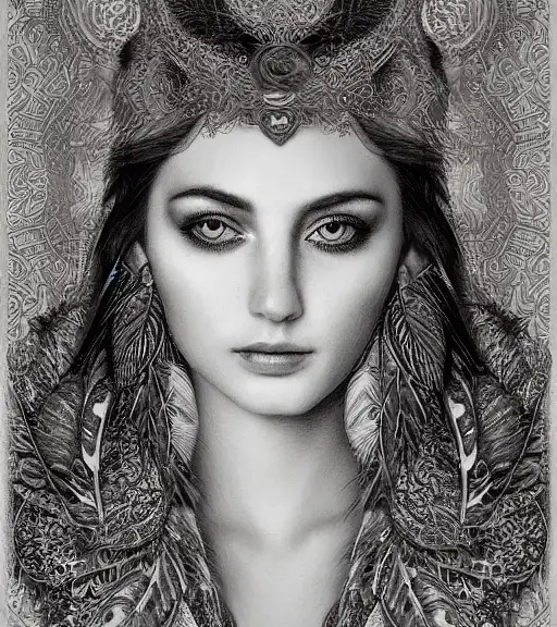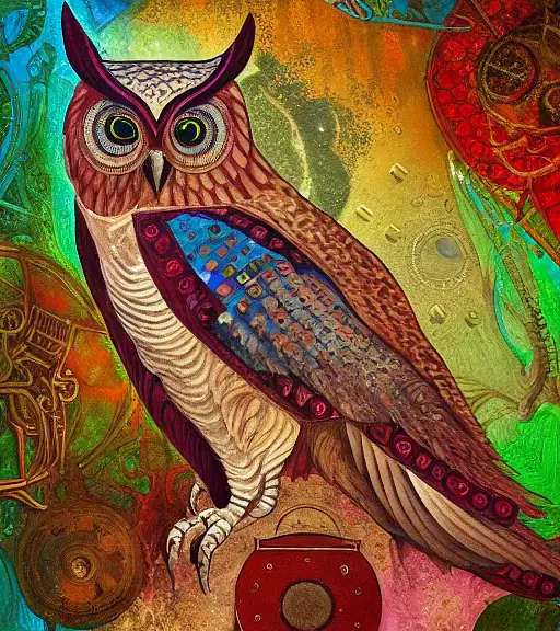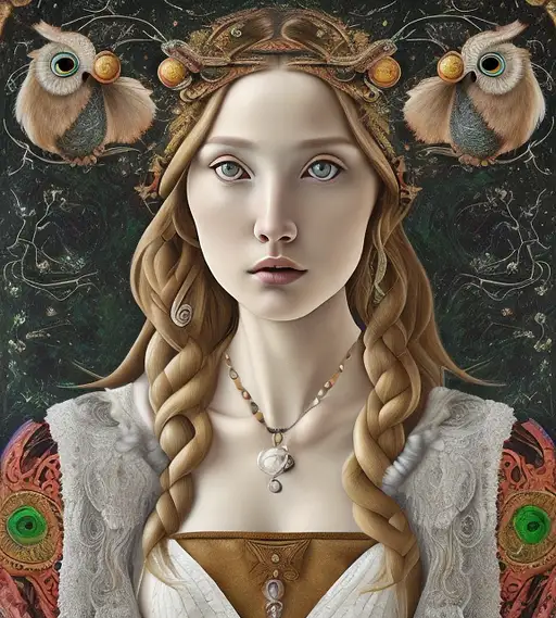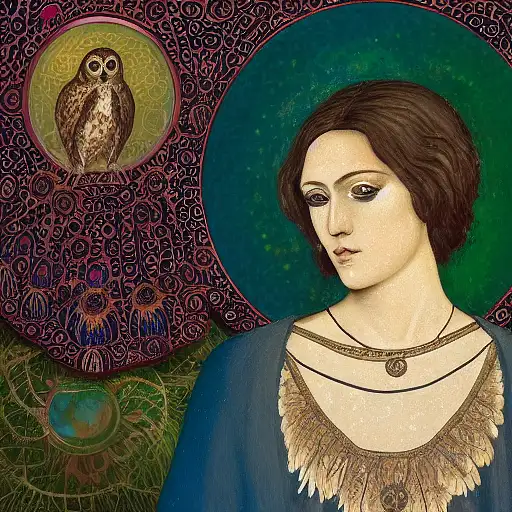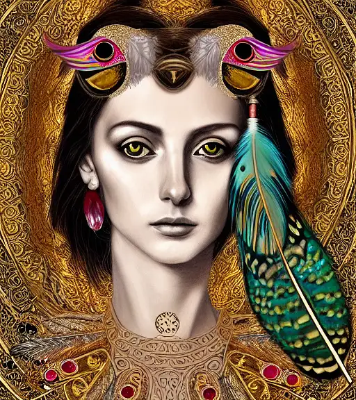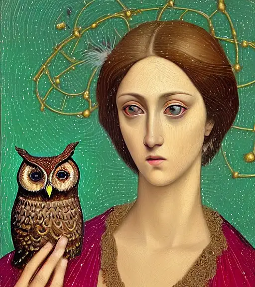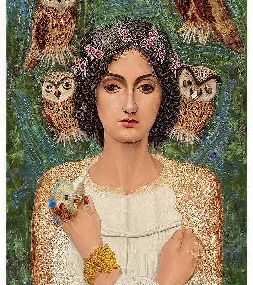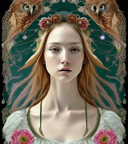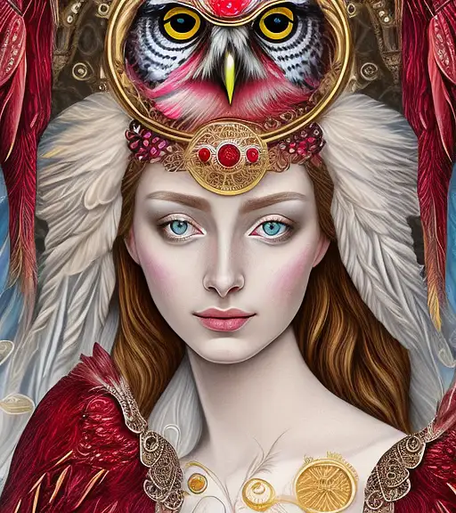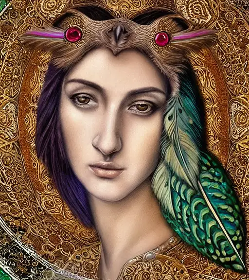 Pencil drawing , high resolution 8k, savinio master painter, Owl, Byzantine artwork, beautiful young lady close up face portrait , intricate background, Owl,feathers, psychedelic hair, elegant white lace robe, hen, steampunk ,gemstones, 8k, vivid colours, green accents, floating, ruby, , delicate features, gold, volumetric lighting, , --ar 12:24 --chaos 35 --uplight cinematic, masterpiece, art by studio ghibli, intricate artwork by john william turner