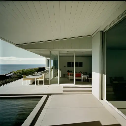 1 year ago Hyper realistic eye level exterior photo of a mid century modern style house overlooking the ocean, daylight, indirect lighting, AD magazine, Frank Lloyd, Eames, Mies van der Rohe Double12ArtLAB 0 41