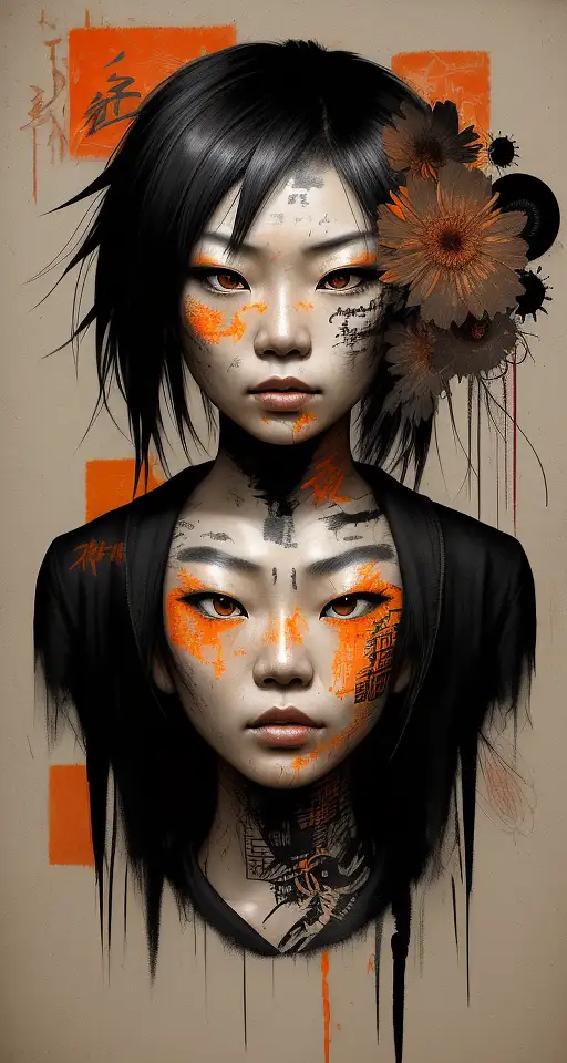 1 year ago Asian woman, beautiful face, black and orange color tones, wabi-sabi art, abstract , punk collage , urbanpunk, flowerpunk, random textures, random graffiti strokes, kanji characters, surreal artwork, Impermanence Double12ArtLAB 1 80