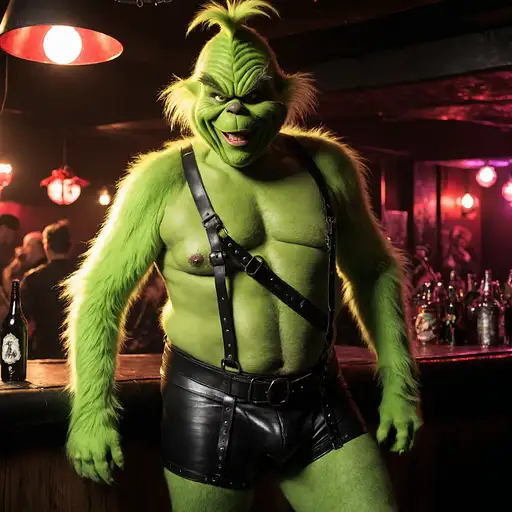 almost 2 years ago full body shot of a gay version of the Grinch in a leather harness, leather underwear, in a gay bar with christmas decorations, evil grin, green furry chest, furry body, r-rated horror comedy movie, unsettling, very high detail, cinematic, dynamic lights photorealism, cinematic, deep shadows, gay interest, gay fetishwear grinch, action scene Efie 0 84