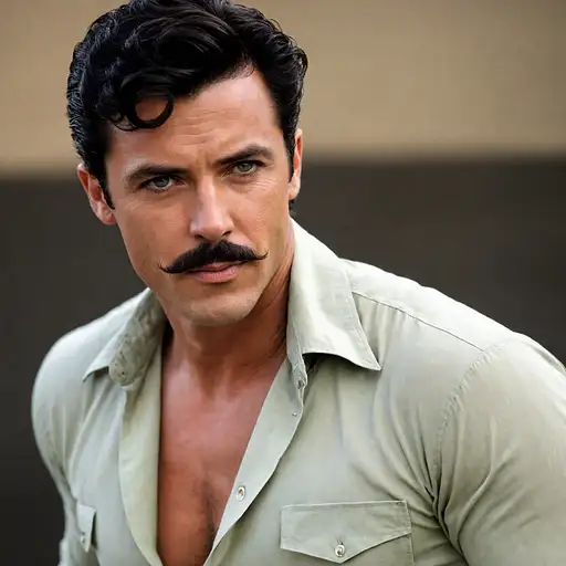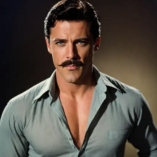 almost 2 years ago A hollywood star unbuttoning his shirt as he makes sexy eye contact with us, he has a a mustache, short black wavy hair, muscular, perfect eyes, revealing shirt, perfect face, colorized, actor man, handsome, 1950s muscular, dramatic light, realistic detail, natural human skin texture, pores, extremely homoerotic Efie 0 63