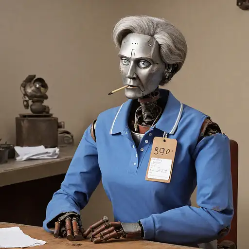 almost 2 years ago An old female robot taking a smoke break at her boring job, she has a polo shirt on with a name tag, fifty-year-old, she has rusty and damaged parts, exhausted-looking robot, facial expression evokes the life-draining lifestyle of working 9-to-5 and living paycheck to paycheck, the robot is bored with her life, masterpiece Efie 1 66