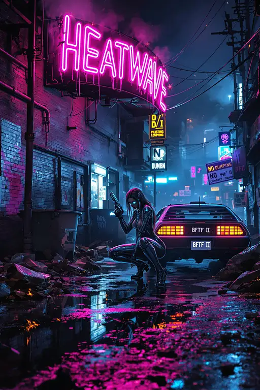 A hyperrealistic 8K cinematic masterpiece blending the gritty, neon-soaked aesthetic of a cyberpunk 1980s Tokyo alleyway with the intense action of a high-tech, futuristic battle. The scene unfolds in a dark, chaotic urban sprawl, alive with swirling fog and flickering neon lights that cast erratic, vivid glows of pink, blue, and fiery amber onto weathered brick walls and reflective puddles on the wet pavement. In the foreground, a stunning female android combatant crouches in the center of the action. Her sleek metallic body is meticulously designed with an anatomically accurate human form, featuring the correct number of limbs, joints, and fingers, each crafted with hyperrealistic precision. Her long, flowing hair, partially synthetic, appears alive as it dances in the subtle, ambient breeze. Her piercing blue glowing eyes exude a sense of unrelenting focus and power. She wields a futuristic laser gun, its barrel emitting a faint blue glow, and her stance conveys readiness and lethal precision, blending strength with elegance. The reflection of surrounding neon lights shimmers across her body, emphasizing the detailed craftsmanship of her design. At the top of the scene, a massive neon sign reading "HEATWAVE" is prominently displayed. The sign glows intensely in vibrant shades of pink and blue, its large, capitalized letters outlined in bright neon tubing. It is mounted on a weathered brick wall, flickering slightly to convey the wear of time. Sparks shoot intermittently from damaged sections of the sign, with one or two letters dimmed or slightly cracked for an authentic dystopian feel. The word "HEATWAVE" is unmistakable, drawing immediate attention as a centerpiece of the composition, its neon glow providing dramatic illumination to the entire scene. Next to the android, an iconic DeLorean car is parked at an angle, its gull-wing doors slightly ajar. The car’s polished silver exterior reflects the neon ambiance with exquisite clarity. The rear license plate is clearly visible, prominently displaying the text "BFTF II" in bold, futuristic black lettering against a white plate. The plate is framed by subtle metallic accents and surrounded by small scuffs and scratches, emphasizing its authenticity. This detail is carefully positioned in the foreground, ensuring it stands out and is easily readable within the scene's complex lighting. The alleyway is a gritty portrait of urban decay. Overflowing dumpsters with dented lids spill refuse across the ground, including torn garbage bags revealing rotting food, broken glass, and discarded electronic components. A shattered bottle lies next to a large puddle with an oily sheen that reflects distorted neon lights. The walls are covered in layers of graffiti and ripped posters advertising long-defunct products or events, their edges curling from years of exposure to the elements. A faded "NO DUMPING" sign hangs crookedly on one wall, partially obscured by fresh graffiti tags. Rusted trash cans and discarded, crumpled flyers litter the ground, adding to the dystopian atmosphere. In one corner, a rusty pipe leaks a small stream of water, forming another reflective puddle below. In the distance, smoldering wreckage and burning cars cast glowing embers into the smoky, fog-filled air, adding depth and tension to the composition. Volumetric lighting streams through the alley, casting dynamic beams of light that highlight the android’s intricate details, the neon sign above, and the DeLorean’s reflective surface. Every element—from the glowing “HEATWAVE” sign to the unmistakable “BFTF II” license plate and the surrounding gritty details—creates a visually immersive cyberpunk scene with vivid precision.