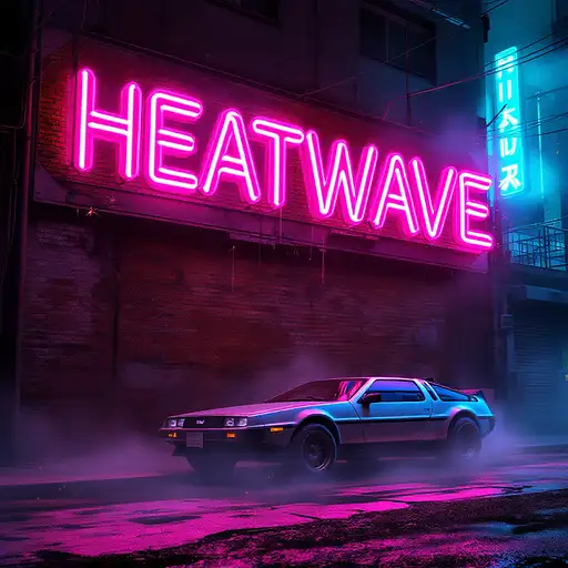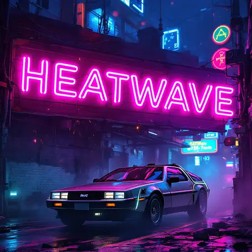 A hyperrealistic 8K cinematic cyberpunk masterpiece combining the vibrant neon energy of a retro-futuristic 1980s Tokyo alleyway with the tension of a high-stakes action scene. The composition centers on a gritty urban setting with dense fog and chaotic, colorful lighting. In the foreground, a central neon sign dominates the upper third of the composition, reading "HEATWAVE" in bold, glowing capital letters. The text is made of vivid, pulsating neon tubes in a gradient of pink and electric blue. It is affixed to a large, weathered brick wall, mounted securely with metallic brackets that reflect the surrounding lights. Sparks intermittently flicker from damaged neon sections, but the word remains entirely legible and the brightest visual focal point of the scene. The "HEATWAVE" sign casts its colors across the scene, ensuring it is unmistakable and vibrant, dominating the viewer's attention. A sleek, metallic DeLorean is parked prominently in the scene's midsection, positioned slightly at an angle to show off both its futuristic design and its rear license plate. The license plate is prominently displayed and reads "BFTF II" in bold black letters, perfectly centered on the reflective silver car. The text is sharp and clear, positioned under a glowing brake light that subtly illuminates the plate, ensuring it stands out even among the chaotic lighting effects. Small scratches and dirt marks on the plate add realism, but the lettering remains flawless and legible, unmistakable to the viewer. The alleyway itself is littered with signs of urban decay. Overflowing dumpsters spill garbage bags filled with scraps, broken glass, and electronic parts. The ground is scattered with torn, wet posters advertising long-forgotten events, their edges curling and peeling. Rusted trash cans are overturned, and a shattered bottle glints in a large puddle, which reflects distorted versions of the neon lights above. Along the walls, layers of graffiti mix with grime and mold, giving the space an authentically decrepit feel. Ripped posters cling to the walls with slogans barely visible, while a faded, torn sticker with the word "HITDORF" is stuck onto the neon sign’s metal frame, subtly tying the urban story together. The female android in the foreground crouches in a combat-ready position, exuding both power and precision. Her sleek, metallic body has humanlike proportions and glowing joints that emit a faint blue light. Her long, semi-organic hair flows naturally, reflecting the glowing pinks and blues of the "HEATWAVE" sign. She holds a futuristic energy weapon, its design radiating an advanced aesthetic. Her expression is intensely focused, with glowing blue eyes adding a piercing gaze that contributes to her presence. The atmosphere is thick with tension. In the background, wrecked vehicles and smoldering debris suggest a recent conflict. Volumetric lighting cuts through the fog, emphasizing key details like the vibrant "HEATWAVE" sign and the sharp "BFTF II" lettering on the DeLorean's license plate. The flickering lights and deep shadows create a dynamic scene filled with layers of visual storytelling.