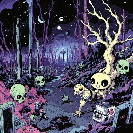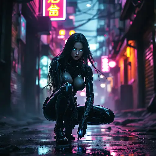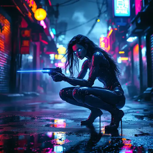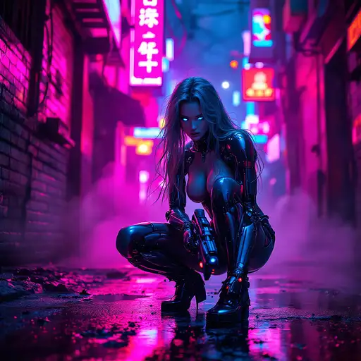 A hyperrealistic 8K cinematic masterpiece blending the gritty, neon-soaked aesthetic of a cyberpunk 1980s Tokyo alleyway with the intense action of a high-tech, futuristic battle. The scene unfolds in a dark, chaotic urban sprawl, alive with swirling fog and flickering neon lights that cast erratic, vivid glows of pink, blue, and fiery amber onto weathered brick walls and reflective puddles on the wet pavement. In the foreground, a stunning female android combatant crouches in the center of the action. Her sleek metallic body is meticulously designed with an anatomically accurate human form, featuring the correct number of limbs, joints, and fingers, each crafted with hyperrealistic precision. Her long, flowing hair, partially synthetic, appears alive as it dances in the subtle, ambient breeze. Her piercing blue glowing eyes exude a sense of unrelenting focus and power. She wields a futuristic laser gun, its barrel emitting a faint blue glow, and her stance conveys readiness and lethal precision, blending strength with elegance. The reflection of surrounding neon lights shimmers across her body, emphasizing the detailed craftsmanship of her design. Above the chaos, a cracked neon sign reading "HEATWAVE" dominates the scene. The sign flickers erratically in vibrant shades of pink and blue, its letters partially distorted as if damaged by years of neglect. The inverted "3"-like shapes in some letters create an unsettling mirrored effect. Sparks intermittently rain down from the damaged tubing, casting glowing embers into the dense fog below. The sign is mounted on a weathered brick wall, framed by graffiti and torn posters, which amplify the dystopian aesthetic. This neon sign is a visual centerpiece, its buzzing glow providing dramatic, intermittent illumination to the scene. Beside the android, an iconic DeLorean stands as a symbol of retro-futuristic design. The car's brushed silver surface reflects the chaotic neon ambiance, and its taillights—one a deep fiery red and the other an amber hue—cut sharply through the haze. On its rear license plate, the bold text "BFTF II" is prominently displayed in a futuristic yet legible font, surrounded by subtle scuff marks and scratches that suggest recent high-speed chases or battles. The license plate's clarity and design are critical, standing out as a key detail in the cinematic tableau. The alleyway itself is a gritty portrait of urban decay. Overflowing dumpsters with dented lids spill refuse across the ground, including torn garbage bags revealing rotting food, broken glass, and discarded electronic components. A shattered bottle lies next to a large puddle with an oily sheen that reflects distorted neon lights. The walls are covered in layers of graffiti and ripped posters advertising long-defunct products or events, their edges curling from years of exposure to the elements. A faded "NO DUMPING" sign hangs crookedly on one wall, partially obscured by fresh graffiti tags. Rusted trash cans and discarded, crumpled flyers litter the ground, adding to the dystopian atmosphere. In one corner, a rusty pipe leaks a small stream of water, forming another reflective puddle below. Burning cars smolder in the distance, their glowing embers casting eerie shadows on the surrounding destruction. The thick fog and smoke create a layered depth, blending the background skyscrapers and neon signs into a hazy tapestry. Volumetric lighting streams through the alley, casting soft yet dynamic beams across the android’s gleaming body and the DeLorean’s angular contours, enhancing the cinematic tension and atmosphere of the scene. The entire composition captures a vivid, action-packed moment in a gritty cyberpunk universe, where every detail, from the glowing "HEATWAVE" sign to the intricate texture of the android’s metallic body, the license plate on the DeLorean, and the grimy urban surroundings, contributes to an immersive, visually striking narrative.