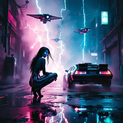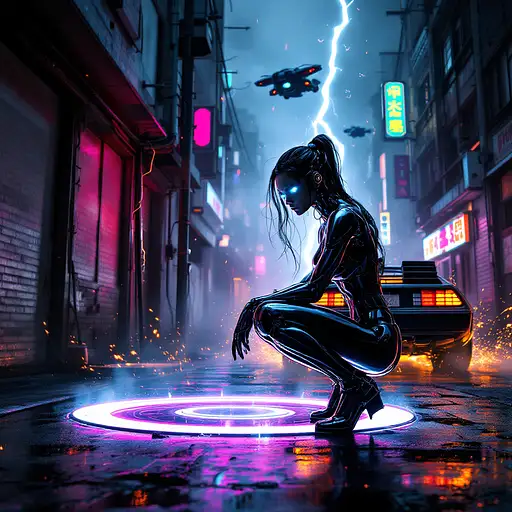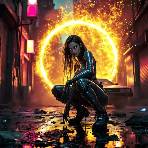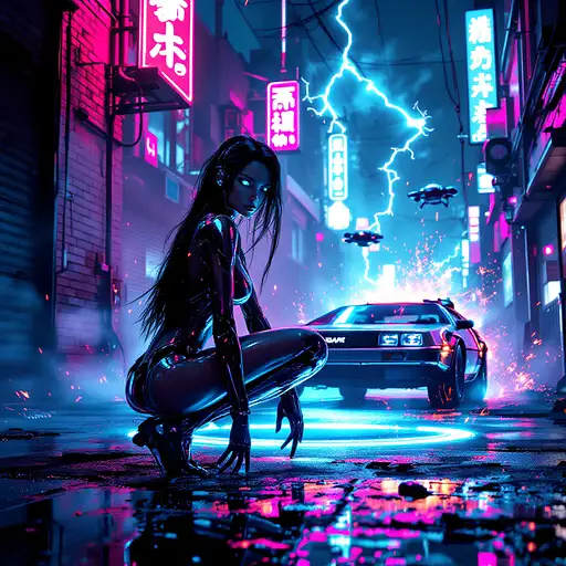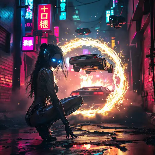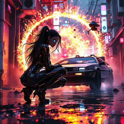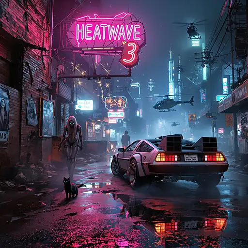 The android combatant crouches in the heart of this dystopian battleground, her sleek metallic body gleaming with photorealistic precision. Her piercing blue glowing eyes, the illuminated "HEATWAVE" sign above, the iconic DeLorean with its personalized license plate, and the chaotic alleyway—alive with gritty details and filled with diverse elements—combine to create an unforgettable cinematic experience. Each added element enriches the narrative depth and immerses the viewer further into this dystopian cyberpunk universe.