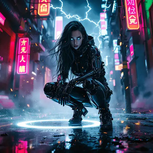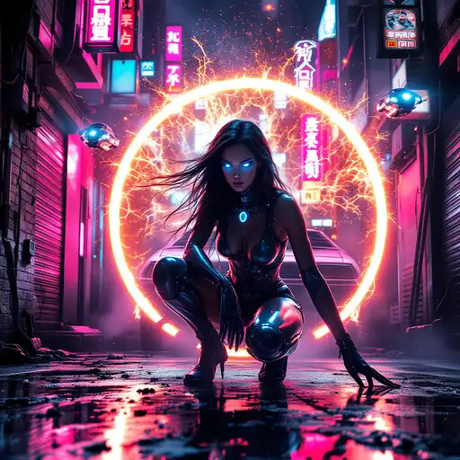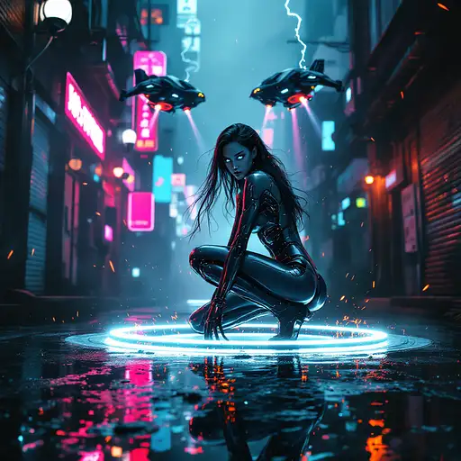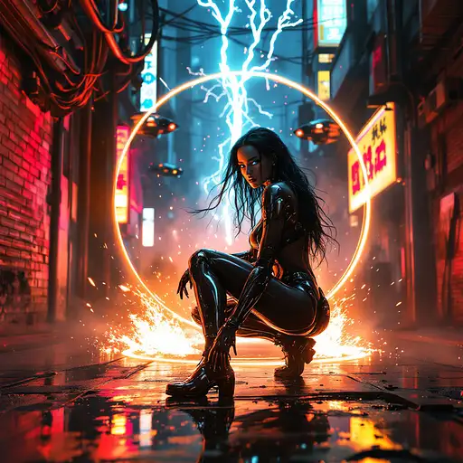 In the foreground, a stunning female android combatant crouches within a glowing circle of light, her sleek metallic body rendered with intricate, photorealistic detail. Her long, flowing hair moves as if caught in a gentle breeze, illuminated by particles of light and fiery sparks from a massive electrical discharge behind her. Her piercing blue glowing eyes lock onto the viewer with an aura of unrelenting power and readiness, embodying the fusion of elegance and lethal precision.