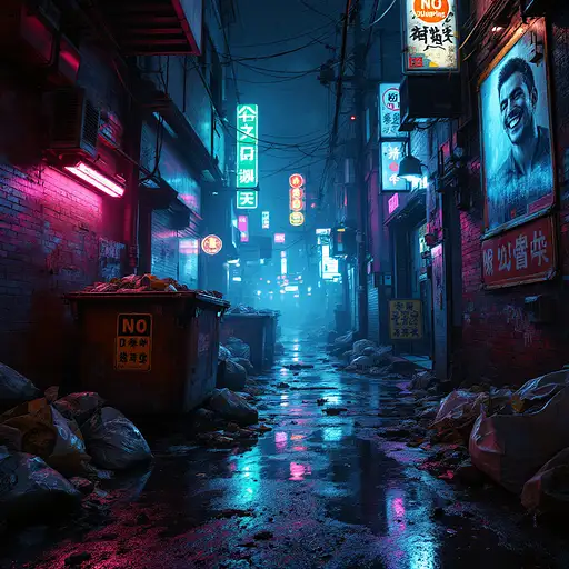 The alleyway itself is a portrait of urban decay, more filthy and oppressive than ever. Overflowing dumpsters, their lids dented and askew, spill refuse across the alley, with garbage bags torn open to reveal rotting food and broken bottles. Pools of murky liquid gather near the rusted trash cans, their surfaces glistening with oil slicks under the neon glow. A faded and tattered “NO DUMPING” sign clings desperately to a graffiti-covered wall, half obscured by a massive poster of a grinning male model advertising a long-forgotten cologne. The poster is ripped and smeared with grime, while around its edges, brownish stains drip downward, adding to the bleakness. Strewn across the ground are discarded newspapers, cigarette butts, and shattered glass, crunching ominously underfoot. The air is heavy with the smell of damp concrete, mold, and decay, creating a palpable sense of discomfort that immerses the viewer in this oppressive environment.