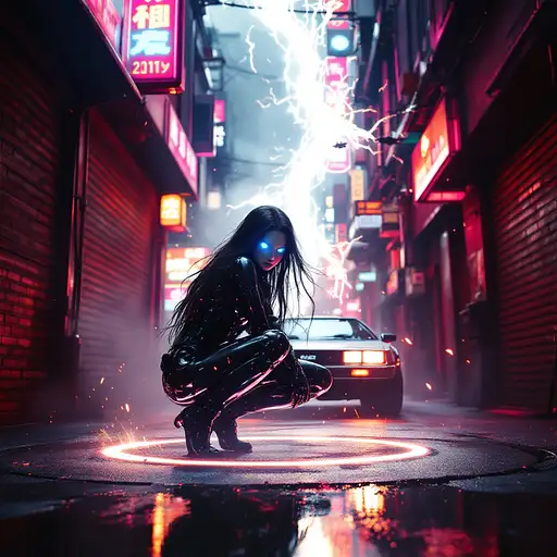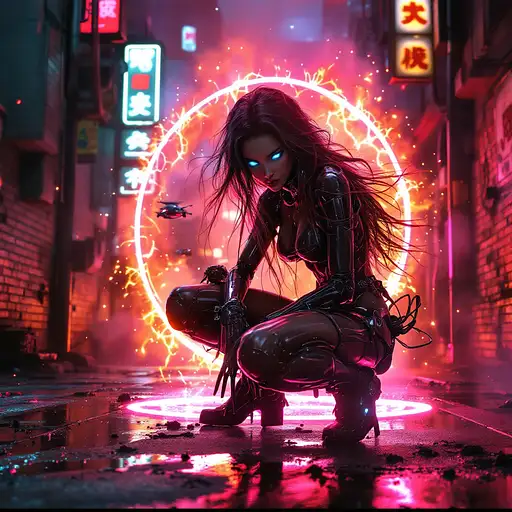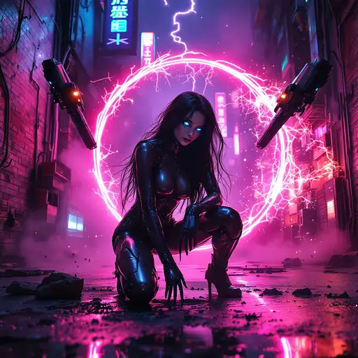 A hyperrealistic 8K cinematic masterpiece blending the gritty, neon-soaked aesthetic of a cyberpunk 1980s Tokyo alleyway with the intense action of a high-tech, futuristic battle. The scene unfolds in a dark, chaotic urban sprawl, alive with swirling fog and flickering neon lights that cast erratic, vivid glows of pink, blue, and fiery amber onto weathered brick walls and reflective puddles on the wet pavement.