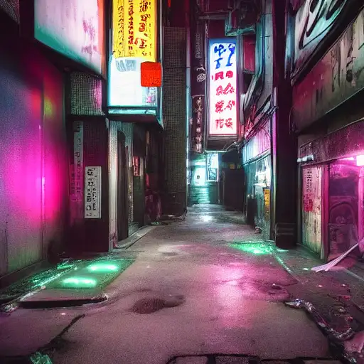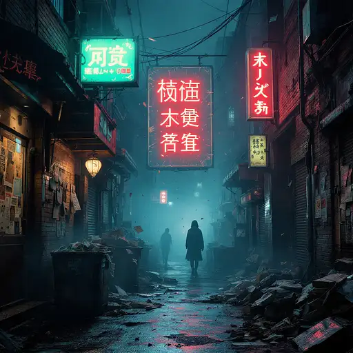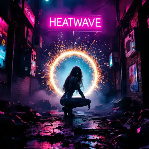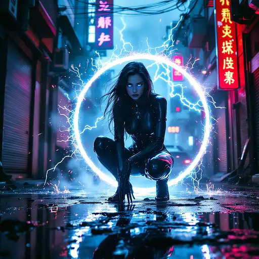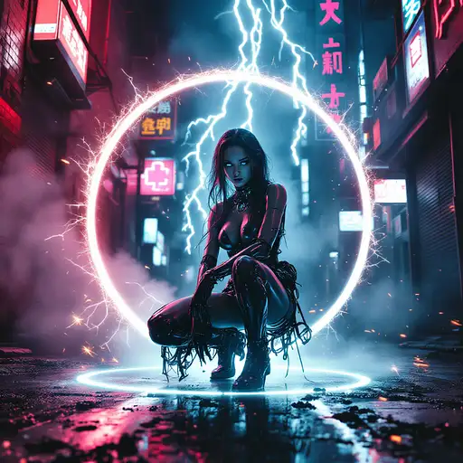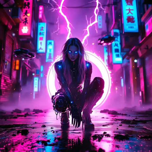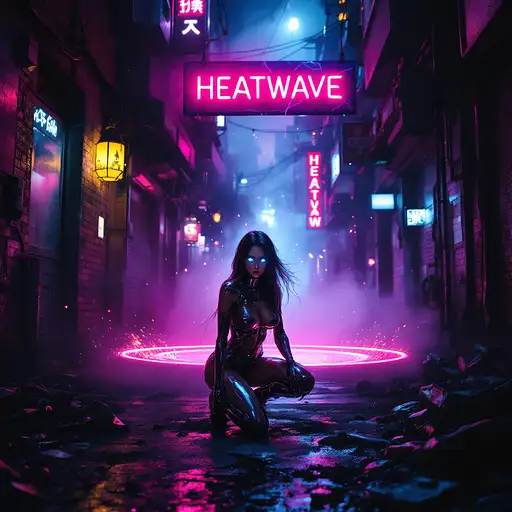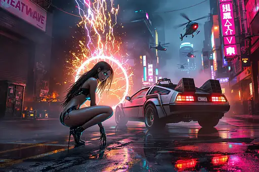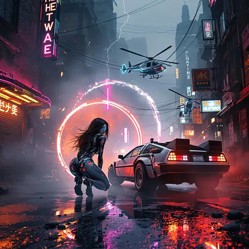 A hyperrealistic 8K cinematic masterpiece blending the gritty, neon-soaked aesthetic of a cyberpunk 1980s Tokyo alleyway with the intense action of a high-tech, futuristic battle. The scene unfolds in a dark, chaotic urban sprawl, alive with swirling fog and flickering neon lights that cast erratic, vivid glows of pink, blue, and fiery amber onto weathered brick walls and reflective puddles on the wet pavement. In the foreground, a stunning female android combatant crouches within a glowing circle of light, her sleek metallic body rendered with intricate, photorealistic detail. Her long, flowing hair moves as if caught in a gentle breeze, illuminated by particles of light and fiery sparks from a massive electrical discharge behind her. Her piercing blue glowing eyes lock onto the viewer with an aura of unrelenting power and readiness, embodying the fusion of elegance and lethal precision. Beside her, an iconic DeLorean, a symbol of retro-futuristic design, stands amidst the chaos, under siege by two hovering attack helicopters armed with M134 Miniguns. Streams of tracer ammunition pierce through the thick, swirling smoke, creating arcs of fiery destruction that illuminate the urban battlefield. The DeLorean's brushed silver metallic body gleams with reflected light from the surrounding neon signs, skyscraper silhouettes, and burning wreckage. Its taillights—one a fiery red and the other an amber hue—cut sharply through the haze, their reflections rippling across the puddles below. The surrounding environment is a tapestry of destruction and decay. Burning cars smolder in the distance, shattered glass and twisted metal scatter across the ground, while torn flyers cling to graffiti-covered walls. Overflowing dumpsters and rusted trash cans add to the dystopian atmosphere, complemented by the distant hum of sirens, the roar of helicopter engines, and the intermittent crackle of neon signs. A cracked neon sign reading "HEATWAVE" flickers erratically, illuminating the scene in pulses of vibrant energy. Volumetric lighting streams through the dense smoke, casting soft, diffused beams across the android’s gleaming body and the DeLorean’s muscular contours. Subtle reflections of nearby city lights ripple across the car’s angular lines, emphasizing its aggressive stance. The background cityscape looms, softened by the haze, with towering high-rises and distant neon signs peeking through the fog. The atmosphere is electric, alive with tension and visual intensity, as if pulled straight from an epic 1980s action-drama infused with high-tech cyberpunk fantasy. Every detail—from the fine grit on the street to the intricate mechanics of the android and the DeLorean’s polished wheels—contributes to the breathtaking realism of the scene. The dynamic composition, vibrant neon hues, and dramatic interplay of light and shadow create an unforgettable, immersive cinematic experience, perfect for showcasing on ArtStation or as a defining piece in the world of digital art.