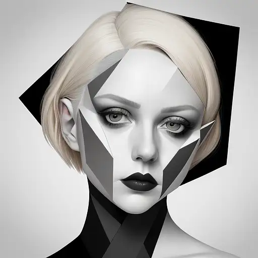 11 months ago A close-up portrait of a woman with short platinum blonde hair, in the style of Irving Penn and Pablo Picasso, merging high-contrast black-and-white photography with abstract cubist elements, sharp angles, and fragmented shapes, the woman's face partially obscured by bold geometric patterns, capturing a striking balance between realism and abstraction, her expression enigmatic and compelling --ar 3:4 --quality 2 --v 6.1 FRACTAL 0 26