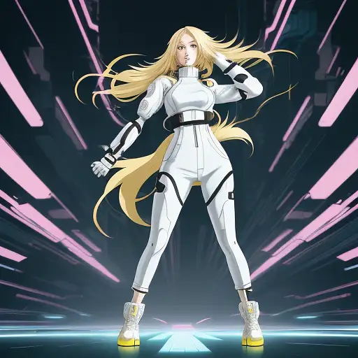 12 months ago a full body anime style illustration of a woman with blond long hair, in a dynamic pose wearing white techwear outfit in the style of akihiko yoshida, futuristic cyberpunk, inspired by ghost in the shell, 90s manga aesthetic, expressive face, yellow background FRACTAL 0 39