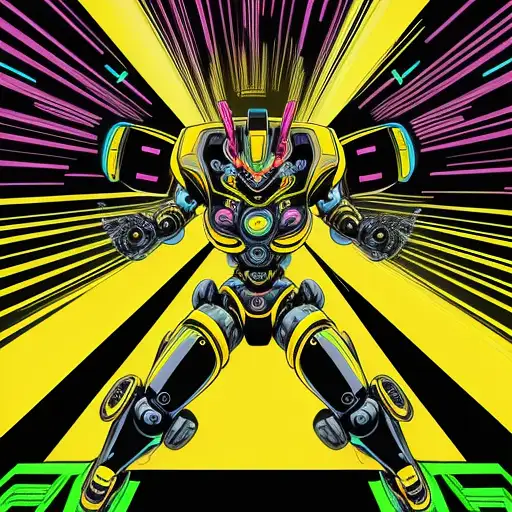 12 months ago a full body anime style illustration of a robot head , in a dynamic pose .,inspired by 90s rave art posters. , , yellow background, for rave music cover artworkbackground, for rave music cover artwork FRACTAL 0 24