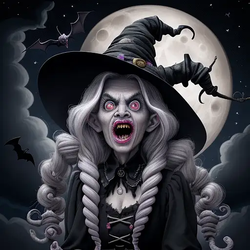 over 2 years ago crazy witch in shock, hair made entirely of skinny snakes, bulging eyes, long nose with wart, wrinkles, evil expression, flying on a broomstick, bats, full moon, stars, clouds Gandoriel 0 90