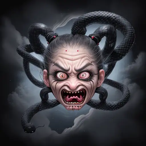 over 2 years ago Mistic ninja in shock, hair made entirely of skinny snakes, mistery expresive eyes, small nose with wart, wrinkles, evil expression, flying on , ghosts, full moon, stars, clouds,Evil face,steam Gandoriel 0 56