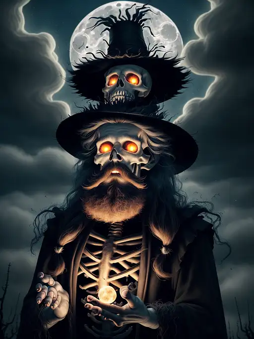 over 2 years ago arcane skeleton sorcerer summoning ancient spirits, hair made entirely of cobweb fibers, fiery deep eyes, beard of enchanted hairs, exaggerated hat, tim burton style, triumphant expression, fireflies, tiny fairies, full moon, stars, clouds, 8k, divine ,hyperrealism,masterpiece Gandoriel 0 41