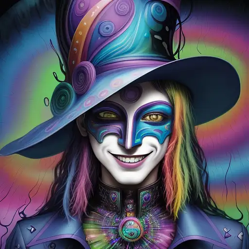 over 2 years ago Mistic clown with hat in psychedelic mode,hat details, made entirely of professional oil watercolor, mask,minute details of the face, background psychedelic matte colors, masterpiece, Splash ,hair insane details,spiral,surreal,fantasy,smiling,clothes details insane,expresive eyes,rare face Gandoriel 0 100