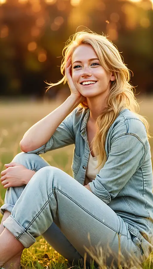 over 1 year ago 3/4 shot photograph of a happy woman with blonde hair sits on the ground in a field, leaning on her knee, (freckles:0.6), wearing jeans and a loose low cut t-shirt, early evening, masterpiece, UHD, natural light, realistic Luv2Grill 4 180