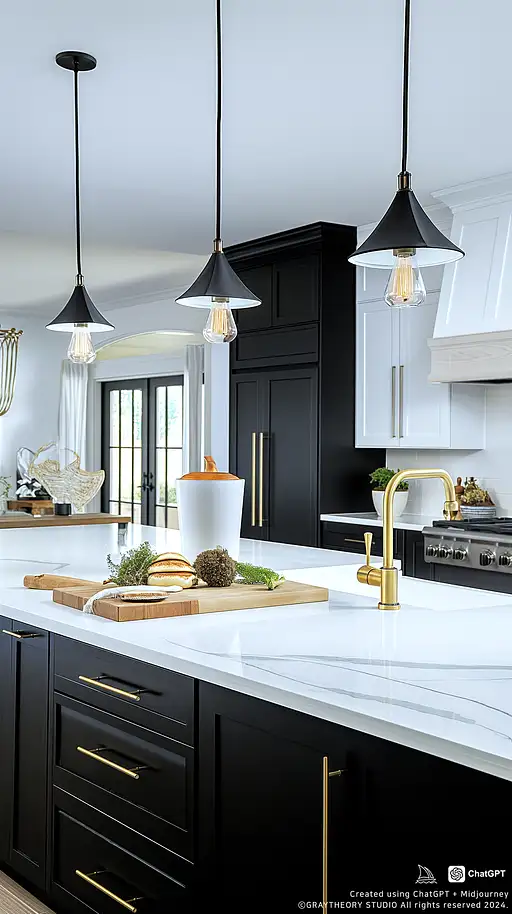 over 1 year ago Candid shot of a modern kitchen, highlighting matte black cabinetry with brass handles, white quartz countertops, a large central island, and pendant lights, Bright morning light creates a welcoming ambiance --ar 9:16 --stylize 30 Grayve PRO 2 60