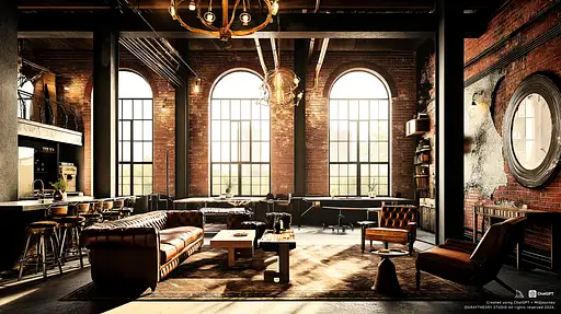 over 1 year ago Front view of an industrial-style loft, exposed brick walls, high ceilings with wooden beams, iron-framed windows, vintage leather sofas, and Edison bulb chandeliers, Soft evening light casts dramatic shadows --ar 16:9 --stylize 40 Grayve PRO 4 120