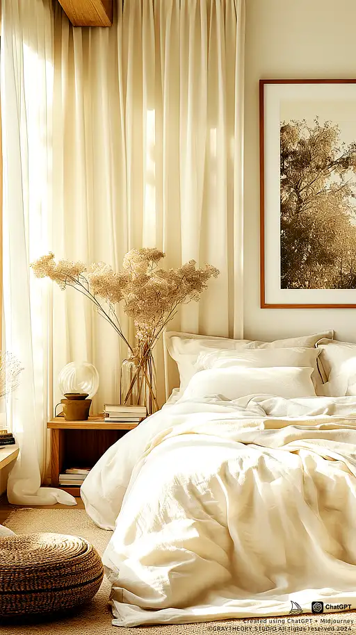 over 1 year ago cinematic, canon EOS 5d, minimalist apartment bedroom, modernism furnishings, beige and white tone, fabric, cozy, shot from a direct angle to focus on the styled bed arrangement, natural sunlight, studio lights –ar 9:16 –s 140 --stylize 750 Grayve PRO 14 960