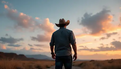 7 months ago Estilo tipo western. Paisaje: playa al atardecer. Un hombre en vista lleva un traje de vestir a la distancia con su cuerpo en perfil a la camara, distant view, mira hacia el cielo. Es importante que aparezca solo la silueta, distant view. No se le ve la cara. GullermoSalv 0 18