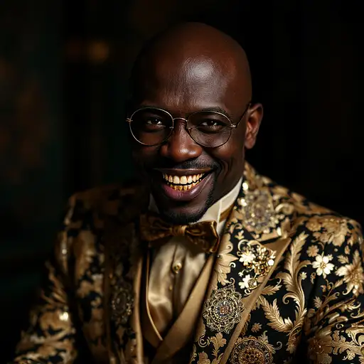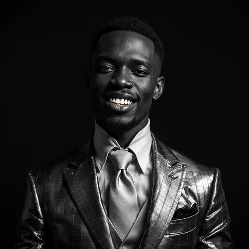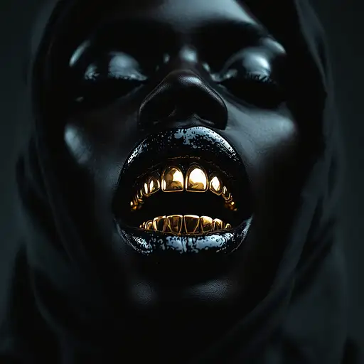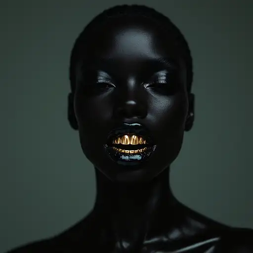 6 months ago a BLACK woman with a large jaw and gold teeth, in the style of futuristic minimalism, restrained forms, darkly romanticism, the bechers' typologies, glossy finish, intricate imagery, close-up shots --ar 4:5 --s 300 --v 6.0 --style raw HIGHENDHEATHEN 0 27