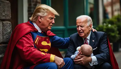 12 months ago président Trump, super Hero, hero costume, sitting on the sidewalk, spanking Joe Biden, Joe Biden carrying, a baby bottle in his mouth, crying with tears in his eyes HamiD6DimaH 0 35