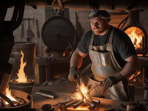 over 1 year ago In the heart of a bustling provincial village, a blacksmith, callused and powerful, hammers away at the red-hot iron, sparks flying, as a crowd watches, waiting in awe and anticipation for the next masterpiece to be born. The lighting is from a large window overhead, casting long shadows that add depth and texture to the scene. The blacksmith's face is etched with the wrinkles of age and wisdom, his eyes piercing and determined, as he pours his soul into every strike. The anvil, beneath him, is a century old, it's rough surface a testament to the countless creations it has birthed. The iron, malleable and hot, dances against the hammer, leaving behind a glowing, beautiful creation, ready to be quenched and taken to the village, where it will serve as a symbol of strength and resilience. The crowd, the setting sun, and the chiles of the blacksmith all add to the atmosphere of this timeless craft, echoing stories of dedication, passion, and creation. IMAGINemyLOOK 0 62