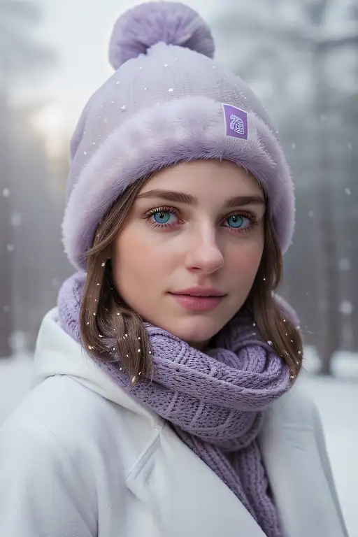 over 1 year ago portrait of a young beautiful female, beautiful detailed eyes, wearing a white coat and scarf, (wearing a light purple hat: 1.2), standing outdoors, snowing,(realistic, ultra realistic, HDR+: 1.2) IceB 0 59