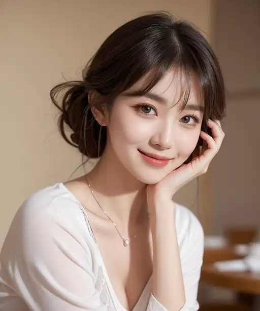 over 1 year ago fashion photography of a beautiful korean woman, (wearing a casual outfit:1.2), ((smile expression)), detailed eyes, restaurant background, detailed face, wide shot, looking at viewer, beautiful eyes, (dimples, normal lips:1.2), intricate details, detailed textures, HDR+ IceB 3 67