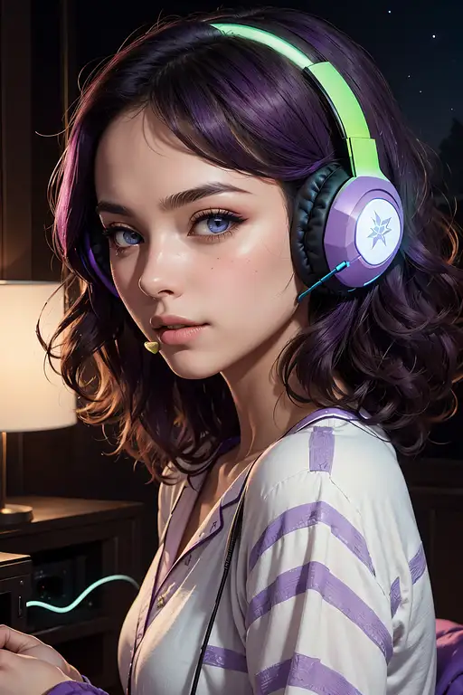 over 1 year ago (masterpiece, top quality, best quality, official art, beautiful and aesthetic:1.2), extreme detailed, 1girl, stunning curly hair, cute face, beautiful eyes, wearing intricate pjamas, listening to music, (wireless purple neon headset:1.3), sitting in her room, detailed, high res IceB 0 46