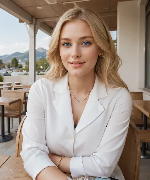 over 1 year ago photo of a beautiful blonde woman, ((smile expression)), detailed eyes, (wearing a modern outfit:1.2), detailed face, 3/4 shot, looking at viewer, beautiful eyes, (dimples, big lips:1.2),she is sitting in an outdoor cafe, beautiful scenery in backdrop, (proportinal anatomy:1.1),wearing a dazziling detailed necklace necklace, proportional hands,(real perspectives) IceB 7 940