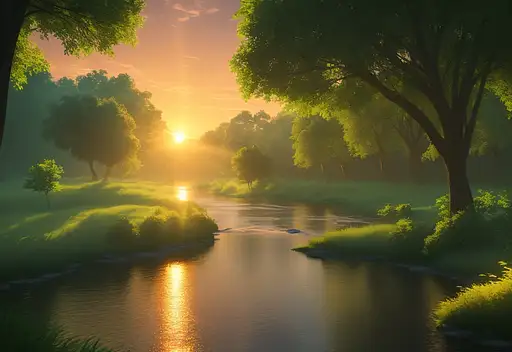2 years ago Beautiful Sunrise over the river surrounded by green trees, stylized volumetric lighting, 4k beautifull detailled --ar 2:3 --uplight Igelschubser 1 39