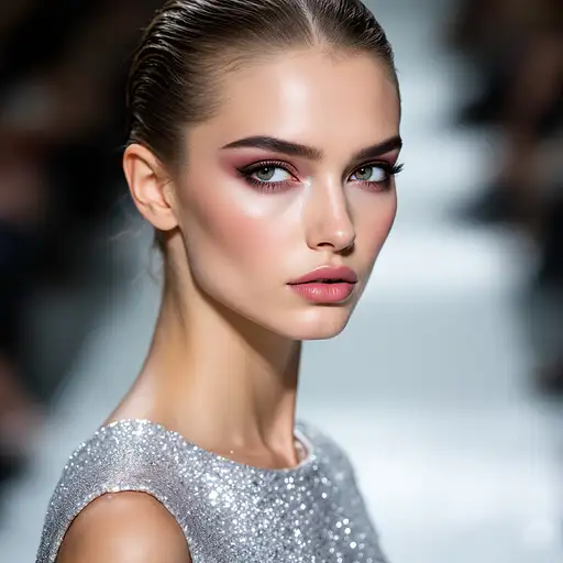 5 months ago close up model in minimalistic shiny glitter silver dress with small crystals on the floor at runway, slicked back hair style, dark pink eye shadows, black eyeliner, cat eye makeup, natural skin, no make-up, pink blush, muted pastel colors TheKashStash 1 42