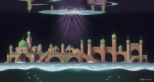 gateway, portal, fish kissing in portal, <lora:style-monument_valley:0.4>, (by Phil Noto, by Pixar, by Cory Loftis, by Ed Mell, by Drew Struzan), illustration, paradoxical geometry, tile, brown tile, building, dome, onion dome, water, stairs, buttress, arch bridge, background, door, wall sharp focus, (HDR), (8k), (gigapixel), (masterpiece), school of fish, M. C. Escher design, symmetrical repeating swarm of fish, dueling fish, Genndy Tartakovsky, green metallic purple fish, purple matte green fish, scroll-work, symmetrical, <lora:fx-fire:0.6> tiling, pattern, repeating, bubbles, water, waves, fish swimming, Cthulhu, M. C. Escher