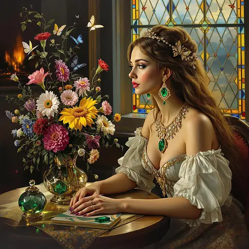 7 months ago It's a still life oil painting and a now late afternoon. In the style of the Dutch Masters, an oil painting depicting a young noblewoman with long flowing hair and elaborate earrings and a necklace made of gold, diamonds, and emeralds, gazing out a stained glass window, with an intricate vase of various flowers, some with butterflies on them by her side. a paper weight made from an emerald, and reflecting across the room. A fireplace behind her sends out mesmerising light. Highly detailed, 8d, surreal, psychedelic and with a touch of Vermeer. 01f9c64afc8 PRO 1 9