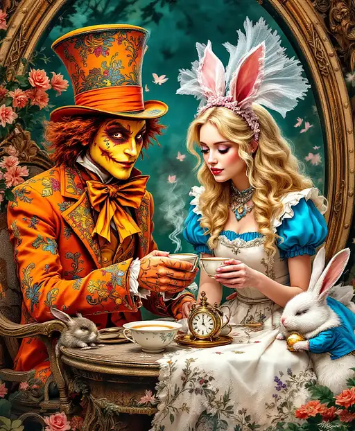 7 months ago Alice and the Hatter Through the Looking Glass Photorealistic. He is dressed in vibrant colors of orange and yellow with prints. His face has orange and yellow mask-like makeup, he has a big top hat. She is blonde and has beautiful wavy hair, a sky blue dress and a white watercolor apron with lots of details. They are sitting drinking tea, next to Alice a sleeping dormouse and an anthropomorphic hare in elegant clothes, there is a white rabbit looking at his pocket watch Morgue PRO 1 20