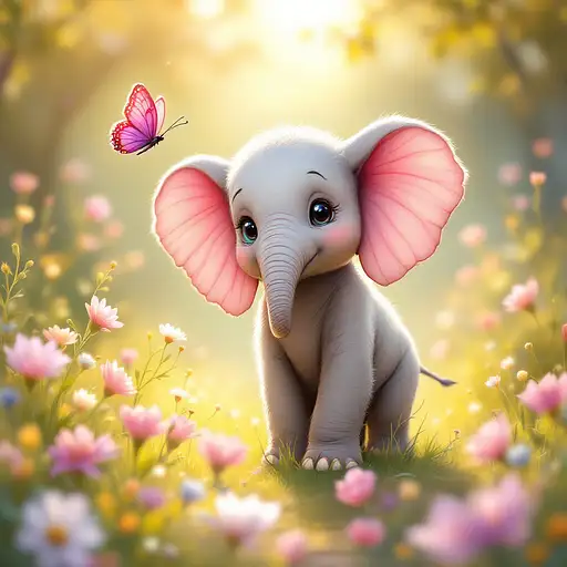 7 months ago Create whimsical baby elephant with petal-like pink ears, standing in a lush floral meadow. Warm golden light bathes the scene, creating a dreamy, magical feel. A vibrant pink and purple butterfly flutters nearby. The art style is painterly and storybook-like, with soft edges and glowing highlights. Morgue PRO 1 21