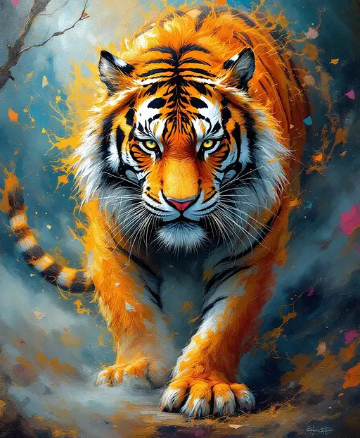 1 month ago A majestic and powerful surreal tiger, painted in dramatic impasto style with thick, textured brushstrokes, almost sculpted in 3D. The tiger’s presence is both fierce and mystical, blending raw strength with dreamlike elegance. Surround it with abstract surreal elements — swirling colors, fragmented light, and ethereal mist — creating a sense of otherworldly power. Rich, vibrant tones of orange, deep blues, and touches of gold emphasize its regal energy, while the impasto technique gives the artwork a tactile, living depth." Morgue PRO 1 18