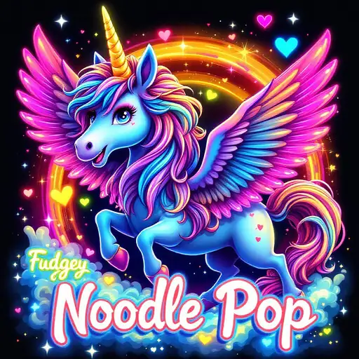 1 month ago epic stunning fantasy ready to print tee shirt design featuring a beautiful sassy chibi cartoon animated anime girl and a unicorn with wings and long long mane and tail, tropical fruit salad fudgey noodle pop, long wavy chunky fudge hair smiling big expressive blue eyes, waving hi to the viewer, dressed in retro cutoff jeans and summer tops,singing, party celebration, love hearts, dance, musical fun funky art graphic black light ultraviolet funky cute chibi Tee shirt design bright bold vibrant rainbow neon colors 3D HDR rainbow electric High visual impact luminous fluorescent colors pearlescent mineral crystallized neon colors mixed with Acrylic coagulated pour, solid black background for contrast heavily textured Zach-effect neon laser X-ray lighting. 3D HDR black light UV poster art. the words "Fudgey Noodle Pop", is overlaid in a semi-clear transparent bright neon 3D Zach-effect fun and funky graffiti cursive script below central image WyldeLyfe PRO 1 12