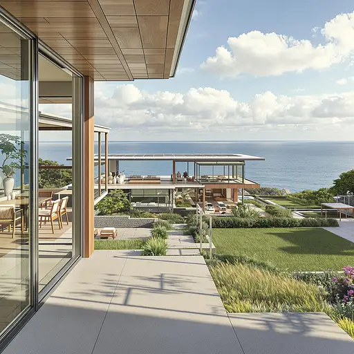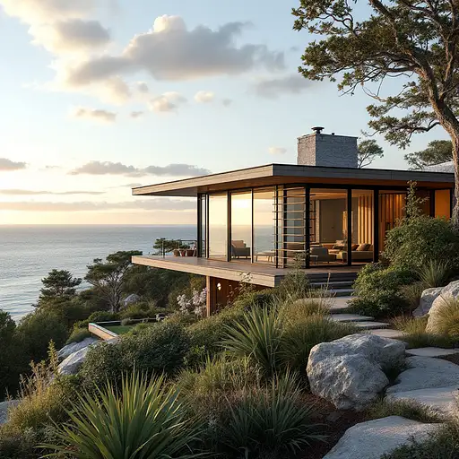 7 months ago Hyper realistic eye level exterior photo of a mid century modern style house overlooking the ocean, daylight, indirect lighting, AD magazine, Frank Lloyd, Eames, Mies van der Rohe Kanwal_Khan 0 27