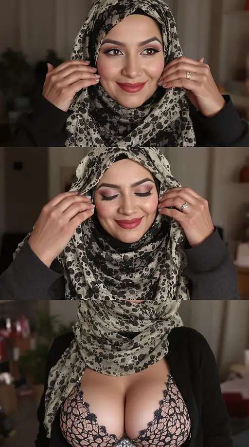 4 months ago A collage of close-up shots of a hot granny with a lace loose hijab, showcasing her joyful personality and capturing moments of happy. (he first frame highlights her cute look,, her head tilted slightly to the side as her hands playfully brush through her hijab. The camera subtly pans from left to right, adding a sense of liveliness to the moment). (In the second frame, highlights her (full body). The camera angle shifts dynamically, zooming in heavy makeup). (The third frame highlights her fat breast with some moles and her wide cleavage)., in soft gaze, solocentered, candid head shot, raw photo, in focus, wearing clothes with nipples, best quality Kinglee92 0 20