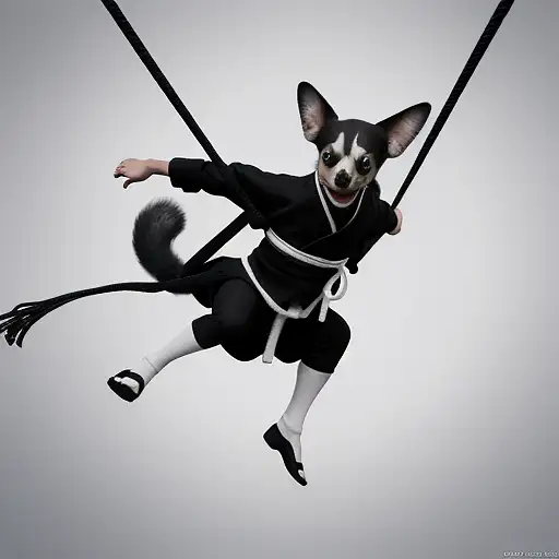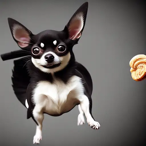 2 years ago A black and white colored chihuahua dressed as a ninja swinging from a rope to steal a croissant. Photo realistic, 8k Laserdad 0 76