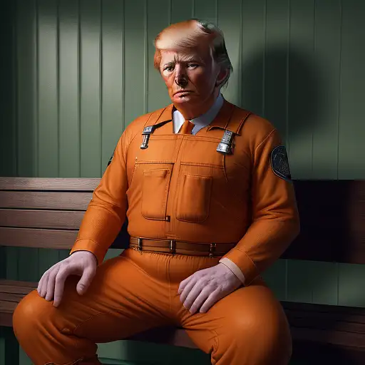 2 years ago High resolution photography8k, intricate detail, photorealistic, realistic light, wide angle, kinkfolk photography Trump dressed in an orange jail overall sitting on a bench in a police station next to a criminal Laserdad 0 68
