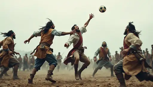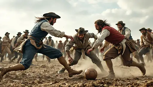 11 months ago un partido de fútbol histórico ambientado en el siglo XVIII. Los jugadores son marinos ingleses, vestidos con uniformes clásicos de la época, como camisetas de rayas, pantalones largos hasta la rodilla y botas, se encuentran en pleno movimiento. Algunos luchan por el balón en el suelo mientras otro jugador lo atrapa en el aire con ambas manos. El ambiente es de un día nublado, en un campo baldío. El escenario transmite un ambiente nostálgico. El campo de juego parece ser de tierra, irregular y sin marcas claras que delimitan las áreas, reflejando las condiciones rudimentarias de los primeros partidos de fútbol. Los jugadores muestran expresiones intensas, reflejando la energía y la competitividad del momento. Las calidades de madera al fondo sugieren un evento comunitario, con espectadores vestidos con ropa típica de la época,. La iluminación suave y los tonos monocromáticos del escenario aportan un toque clásico, ideal para recrear un instante de la historia deportiva Leinad27 0 29