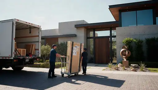 16 days ago A modern luxury house with minimalist architecture, featuring large glass panels, concrete walls, and a massive wooden front door. In front of the house, two professional movers are unloading a large wooden crate from a white moving truck. The movers wear navy blue uniforms and black caps. The wooden crate is now sturdier, more detailed, with smooth plywood panels, visible metal reinforcements, and clear shipping labels, resting perfectly on a metal dolly. The sunlight casts soft, realistic shadows on the stone driveway. To the right, a modern abstract bronze sculpture decorates a small desert-style garden with rocks and dry plants. The scene is viewed from a slightly lower angle, giving a more cinematic perspective with better composition and depth of field. Ultra-realistic, 8K, natural light, high-quality textures, architectural photography style. Luker1 0 16