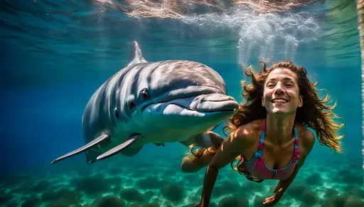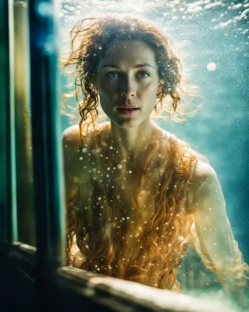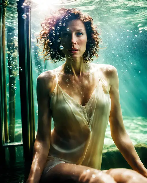 underwater, soft light, faded colors, volumetric lighting, long exposure photographic portrait, air bubbles from open mouth, small air bubbles in hair, underwater, swimming next to a dolphin, holding on to a dolphin's fin, fine curly hair, flowing hair floating in water, hard beams of light penetrating water, glare, light refraction under water, caustics, realistic, , hyper-realistic, photo-realistic - in the style of hyper-realistic portraits, a perfect photograph of the curvy 40-year-old ((Caitriona Balfe)) portrait photo of stylish beautiful girl, asymmetrical haircut, highlights, every hair stands out, cyberpunk aesthetic, heavenly beauty, 8k, 50mm, f/1. 4, high detail, sharp focus, perfect anatomy