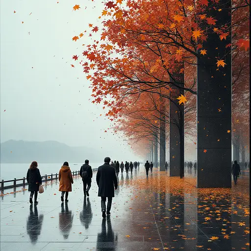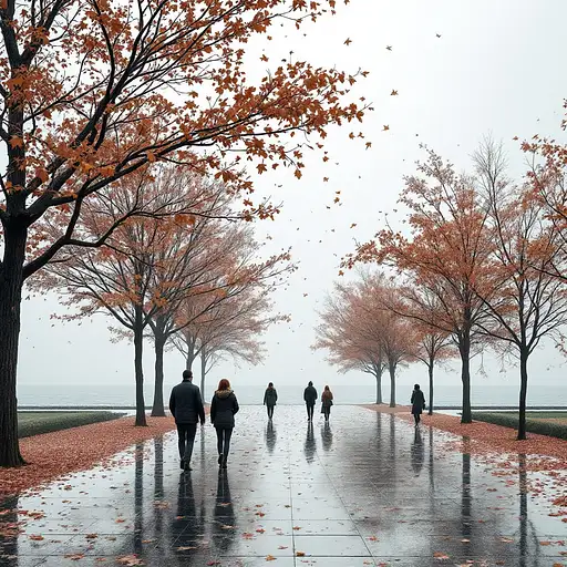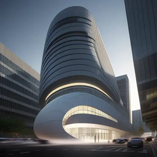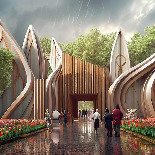 fantasy art, parametric architecture, Thomas Heatherwick the Seed Cathedral pavillion, octane render, hyper-detailed render, 8k, cinema 4d, unreal engine, Caustics, glowing, back-lit, moody, fog, stormy, revoThe design of the entrance and front door with a formal index for a park road in 5050, inspired by the modernism architectural style using the words: park road, Karaj, urban symbol, inspired by the works of Alireza Mashhadi Mirza, Behzad Atabaki, in a way that speaks of an indicative form In the concept of identity, it should be a garden with a river, the work of Mashhad Mirza, modeled with 3D Max, rendering with V-Ray, rainy weather, cloudy sky, people and landscaping on Khai Street.